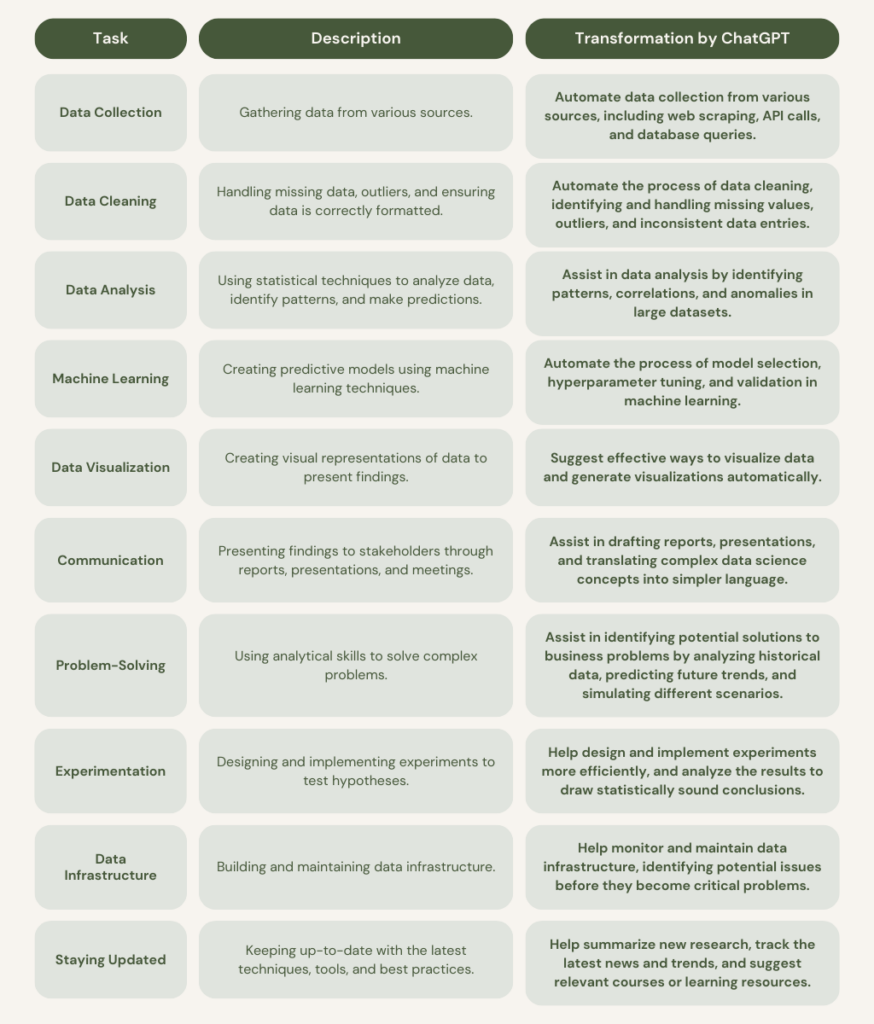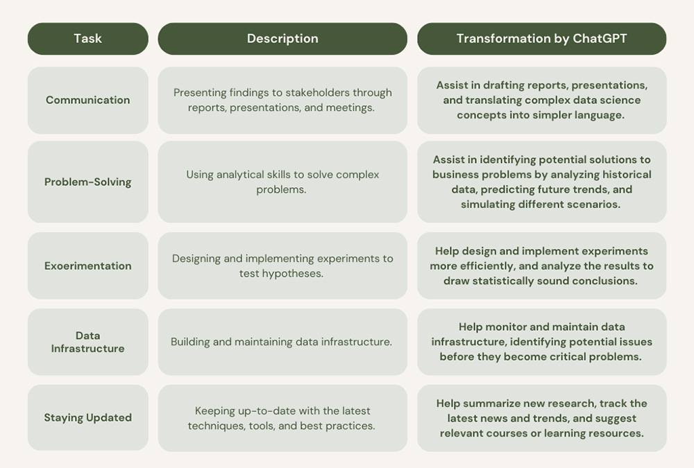 In general, routine tasks that include pattern recognition, large-scale data analysis, and repetitive operations are more likely to be automated by AI models like ChatGPT. In addition to some machine learning, communication, problem-solving, experimentation, data infrastructure management, and keeping up with the most recent trends and methodologies, these jobs frequently require data collecting, cleaning, analysis, and visualisation.