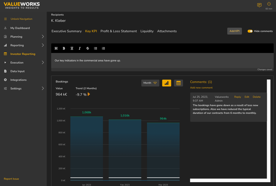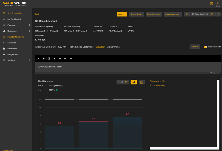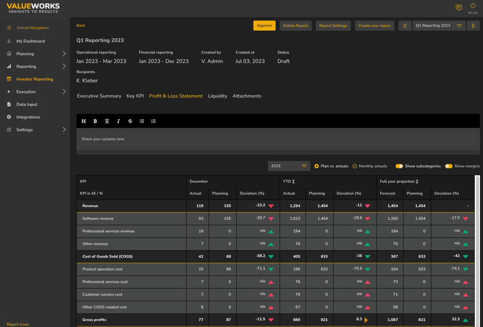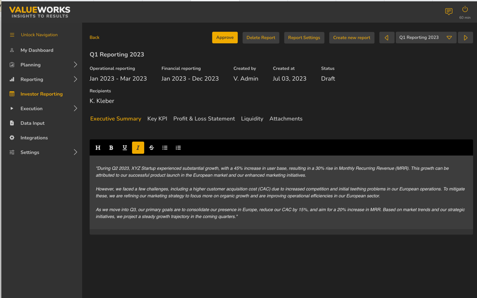 Investor reports are an important way for startups and their backers to talk to each other. They show not only how well your company is doing financially, but also how well it is running, what its strategic direction is, and what its future potential is. A well-thought-out investor report can help your company and its investors build trust, be more open, and improve their relationship with each other. This blog post will show you the most important parts of a good investment report, such as the executive summary, key performance indicators (KPIs), deep-dive graphics, financial P&L, liquidity analysis, and attachments.