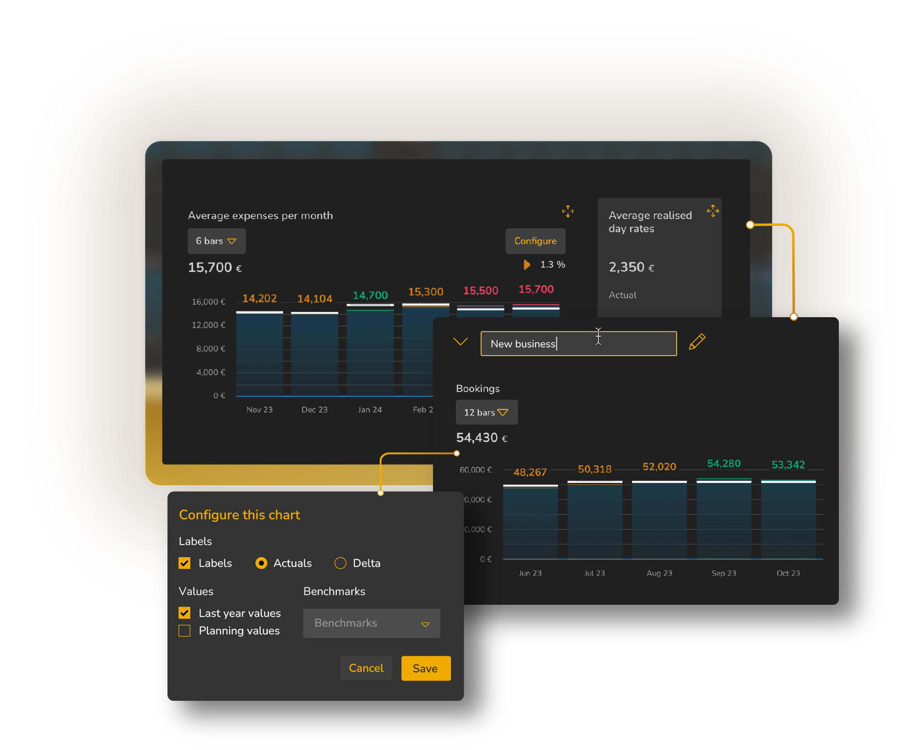 - Transform tables into charts: the basis is the list view for each key figure (e.g. individual bookings, custom list)