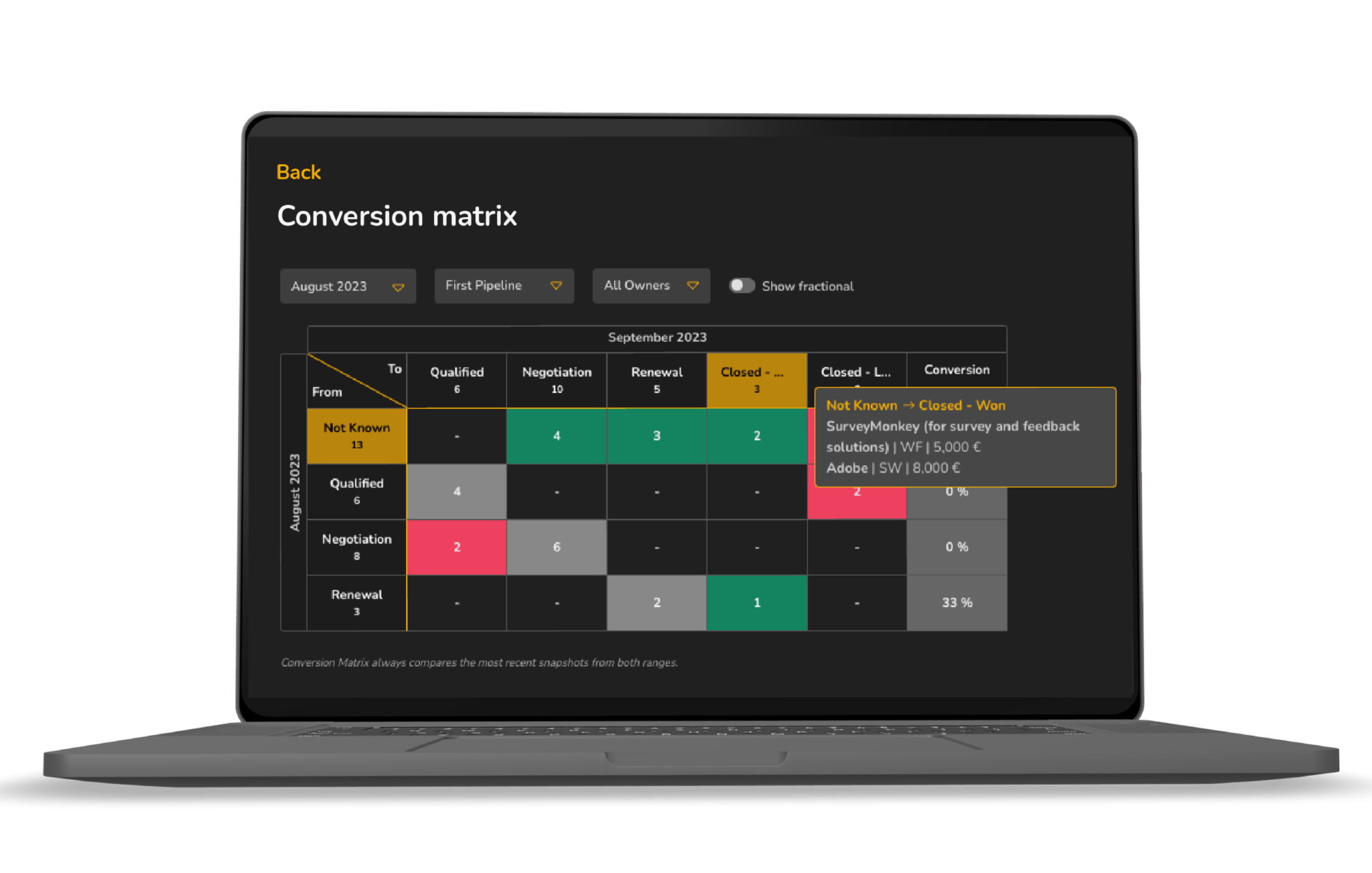 The charts are based on long-standing management consulting experience and represent our suggestions for optimal sales funnel management. As such, they can be filtered and minimally altered, but free chart creation is covered by our charts feature, which enables 100% flexibility when it comes to chart creation.